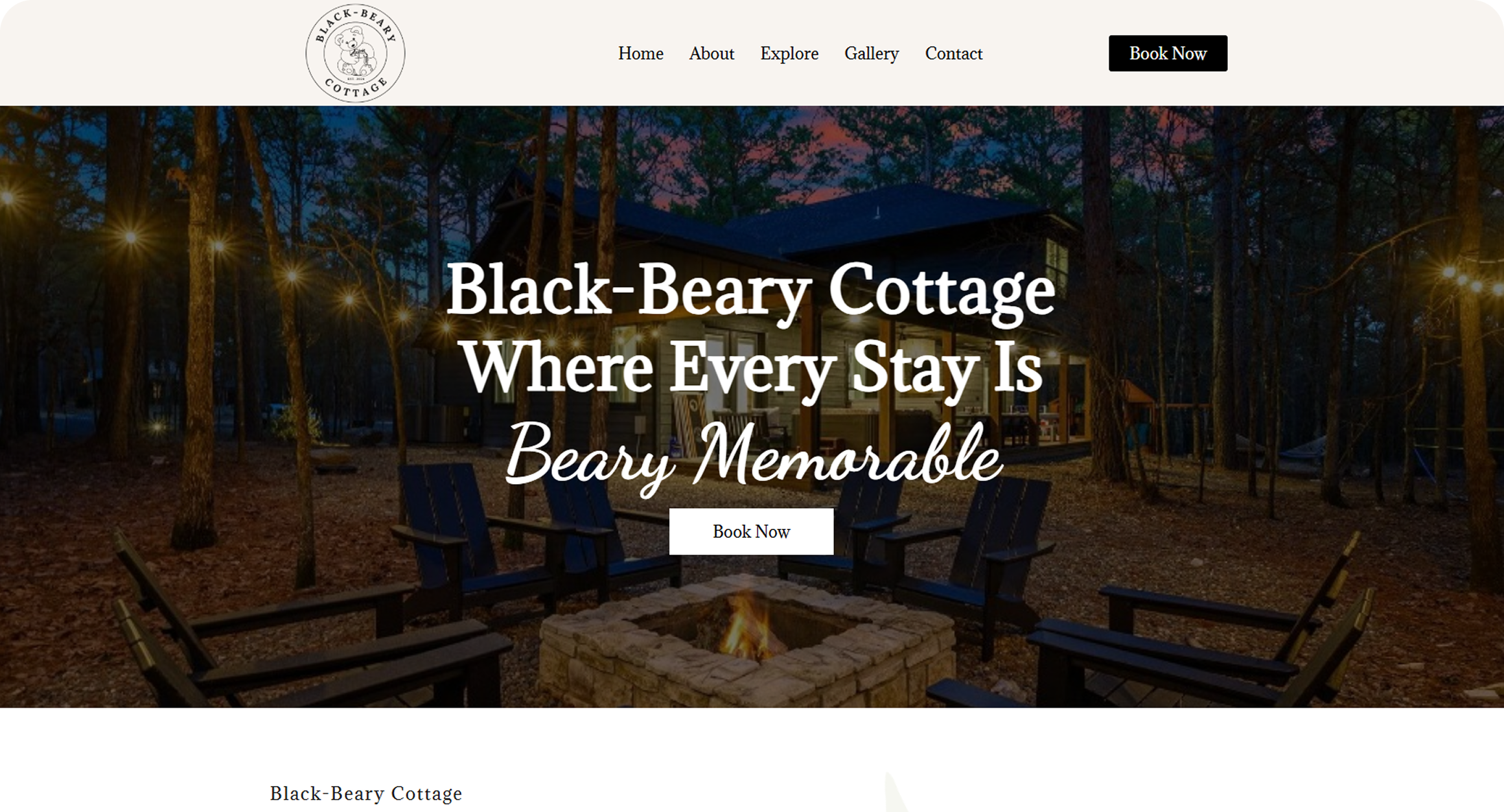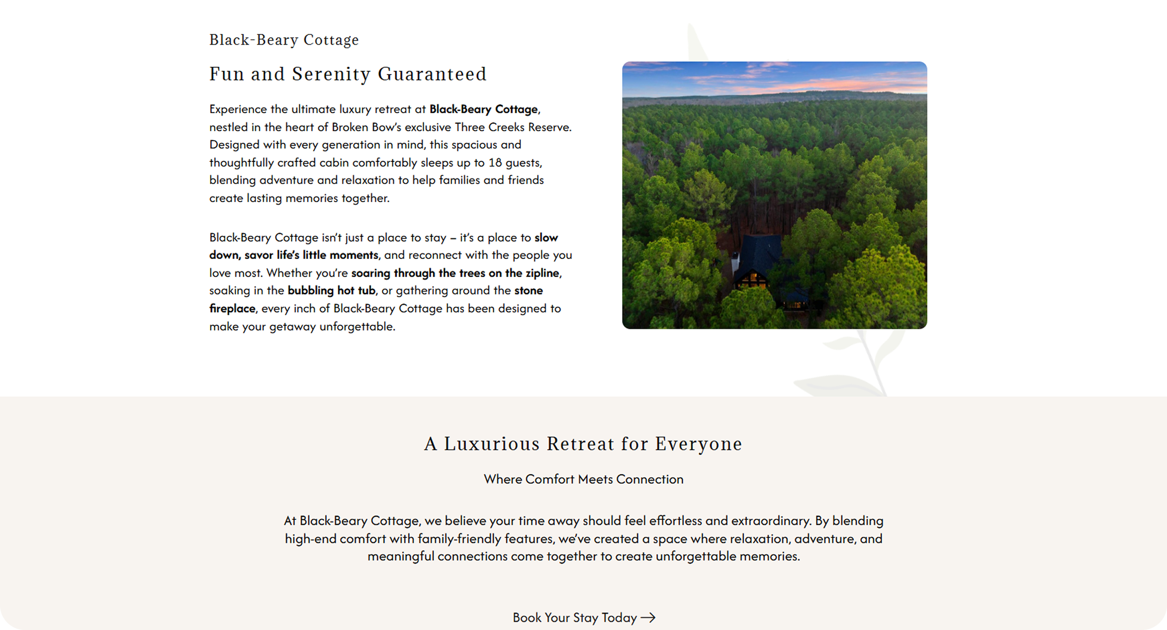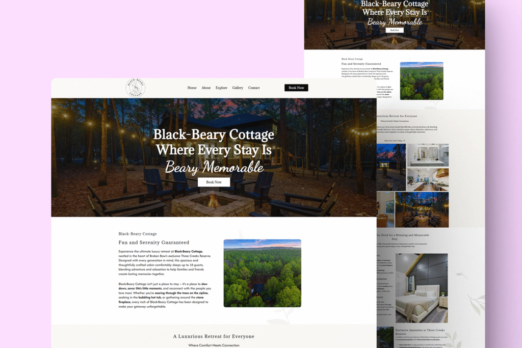Black Beary Cottage is a premium vacation rental located in Broken Bow, Oklahoma, offering guests a peaceful getaway surrounded by nature, comfort, and modern amenities. The goal of this project was to create a visually engaging, easy-to-navigate website that highlights the cabin’s unique features, showcases high-quality imagery, and provides a smooth path for guests to check availability and book their stay.