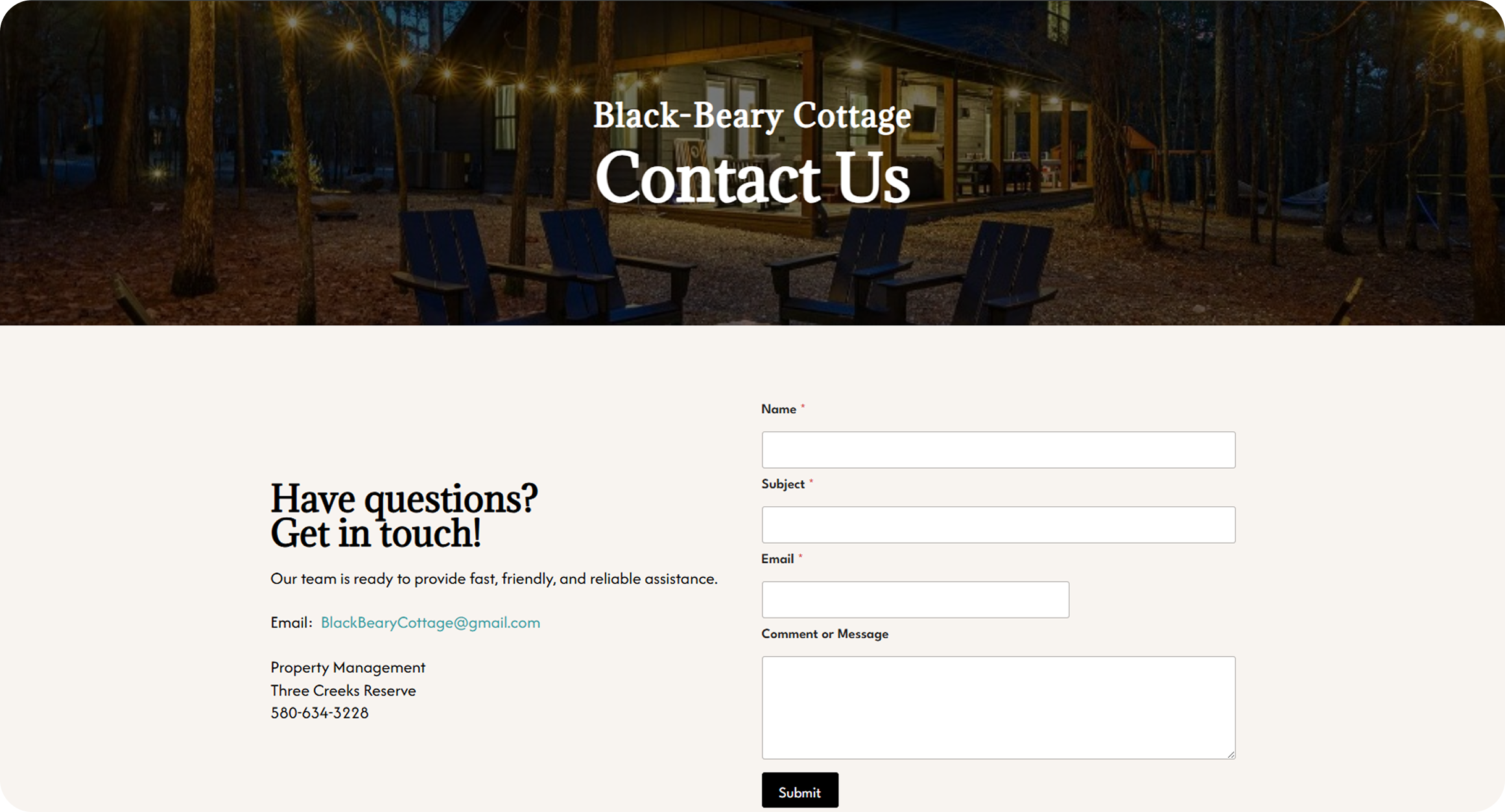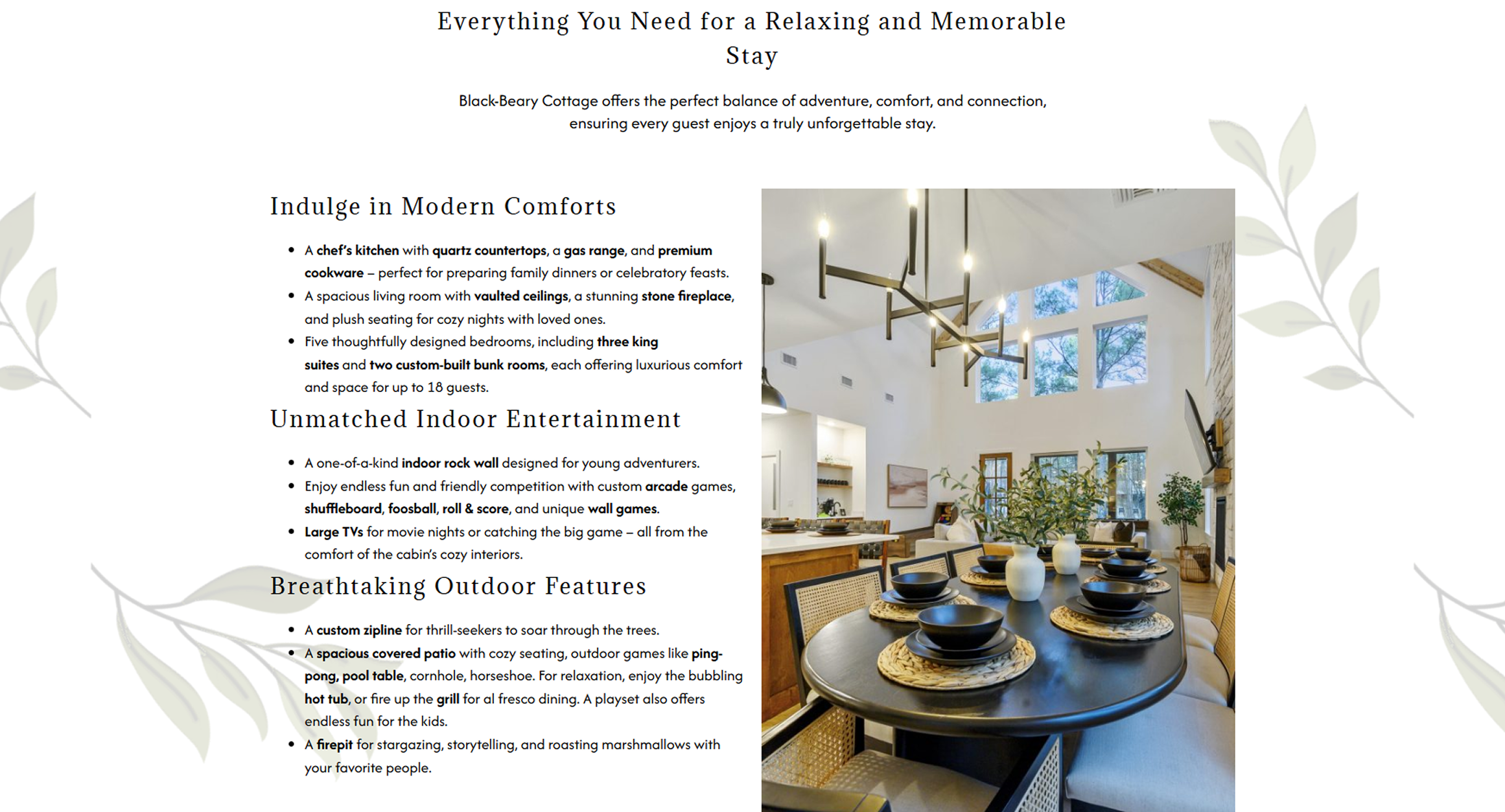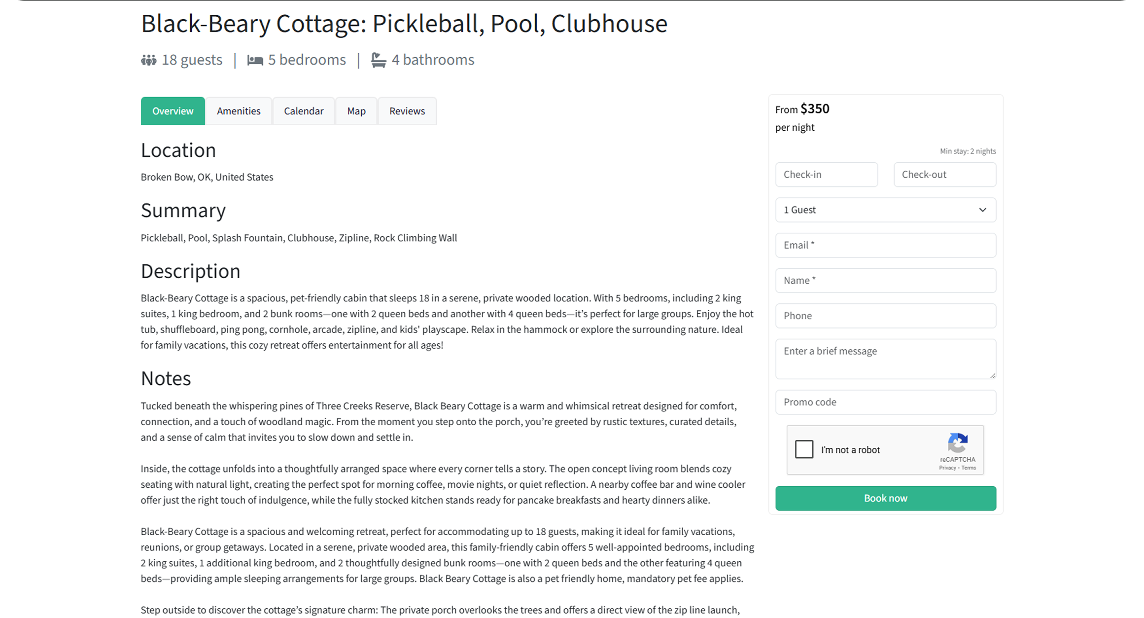 Black Beary Cottage is a premium vacation rental located in Broken Bow, Oklahoma, offering guests a peaceful getaway surrounded by nature, comfort, and modern amenities. The goal of this project was to create a visually engaging, easy-to-navigate website that highlights the cabin’s unique features, showcases high-quality imagery, and provides a smooth path for guests to check availability and book their stay.