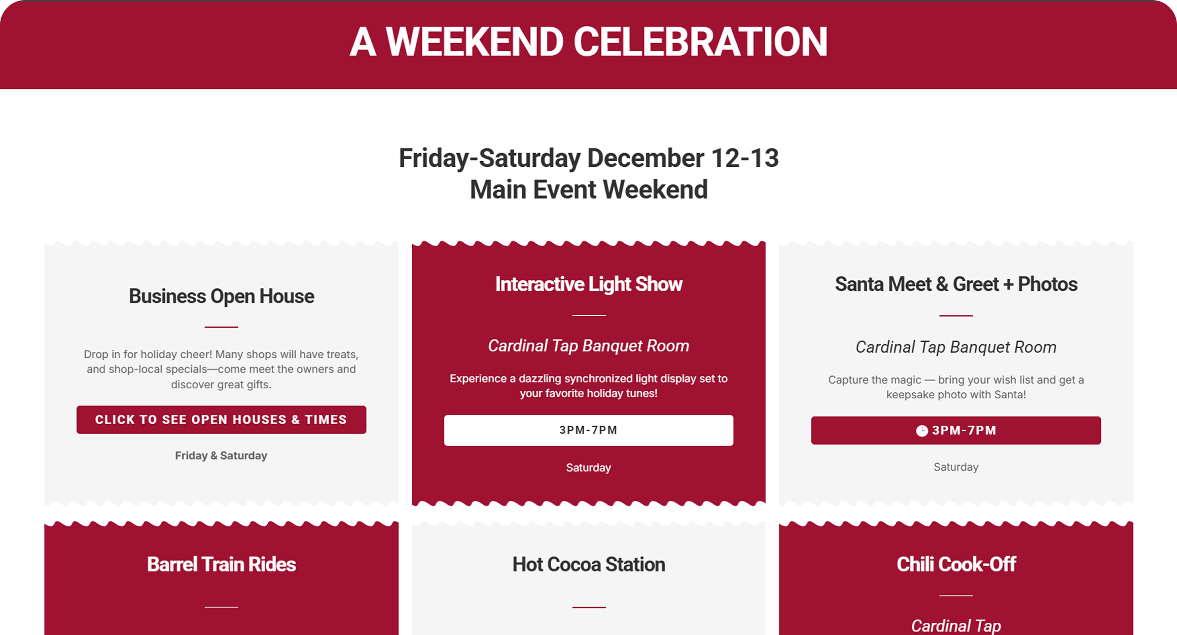 The project included designing and launching a single-page event website along with key print assets such as a business passport booklet and promotional flyer. The goal was to clearly communicate event details, encourage community participation, and create a cohesive holiday experience both online and offline.